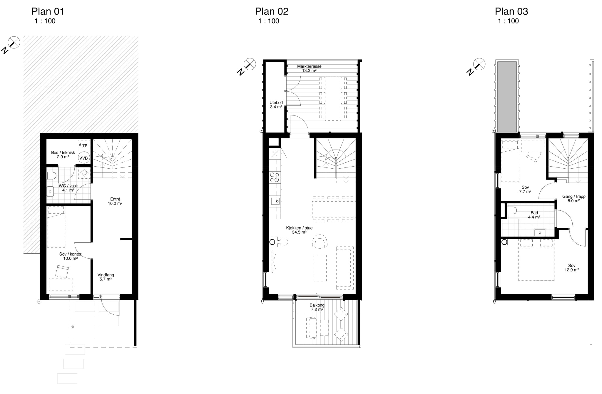 De moderne rekkehusene i Hus A strekker seg over tre etasjer, med tre soverom, bad, wc/ vaskerom og gode og romslige utearealer. Husene vender mot det sosiale og barnevennlige gatetunet, og du finner en småbarnslekeplass med benker og sandkasse rett utenfor døren.