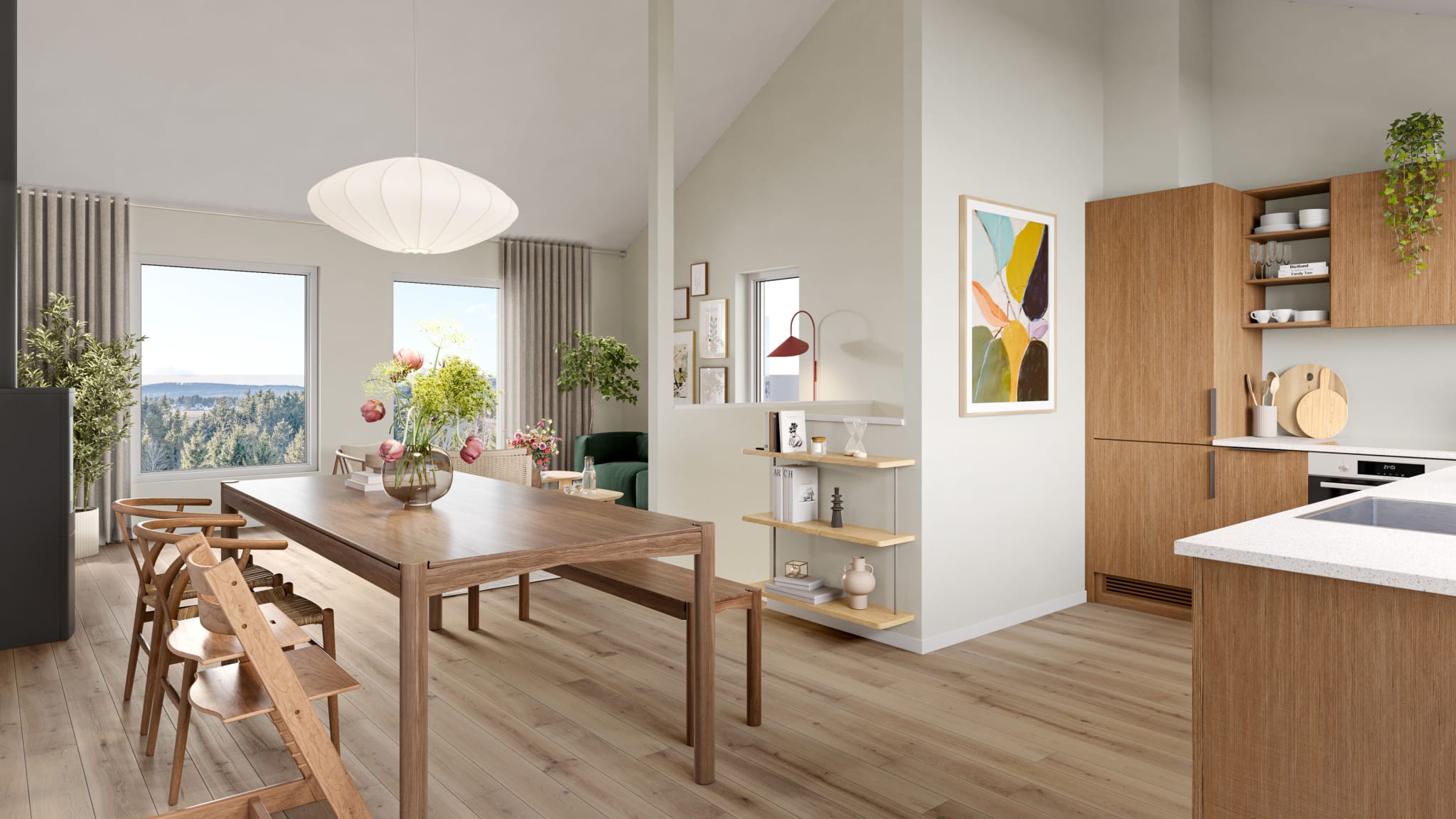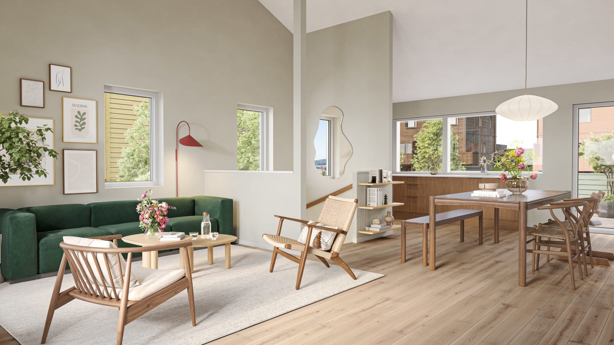 I husets første etasje finner du markterrasse, med kort vei til en av Plommehagens mange lekeplasser, du finner tvstue/kontor, hovedsoverom, bad/vaskerom og en bod/teknisk rom. Videre går vi opp til husets andre etasje hvor du finner to soverom, entre og bad. Når du kommer opp i tredje etasje har du stue og kjøkken med 4 meters takhøyde, fantastisk utsikt og en stor balkong med utgang fra kjøkkenet.