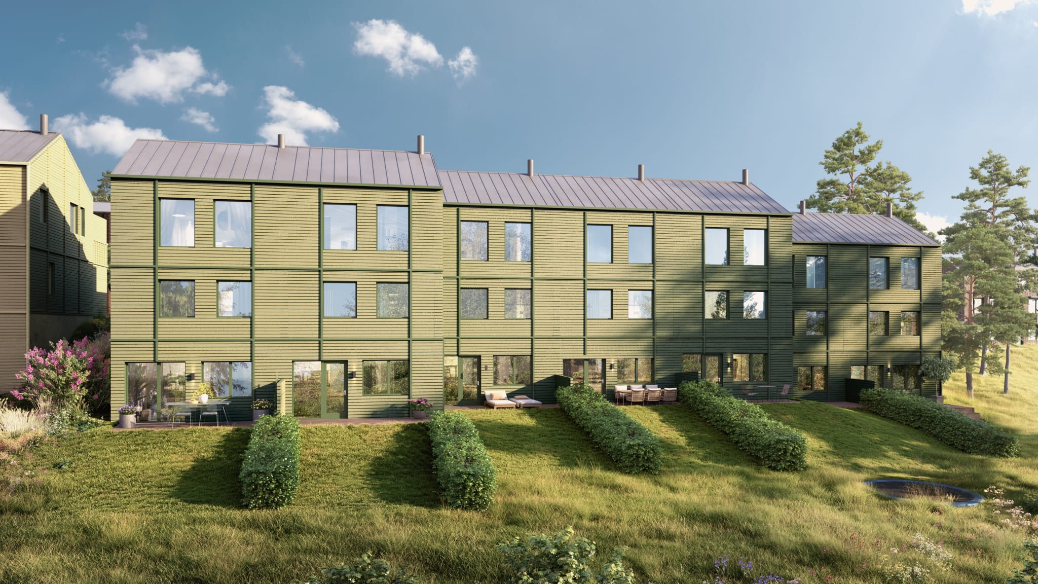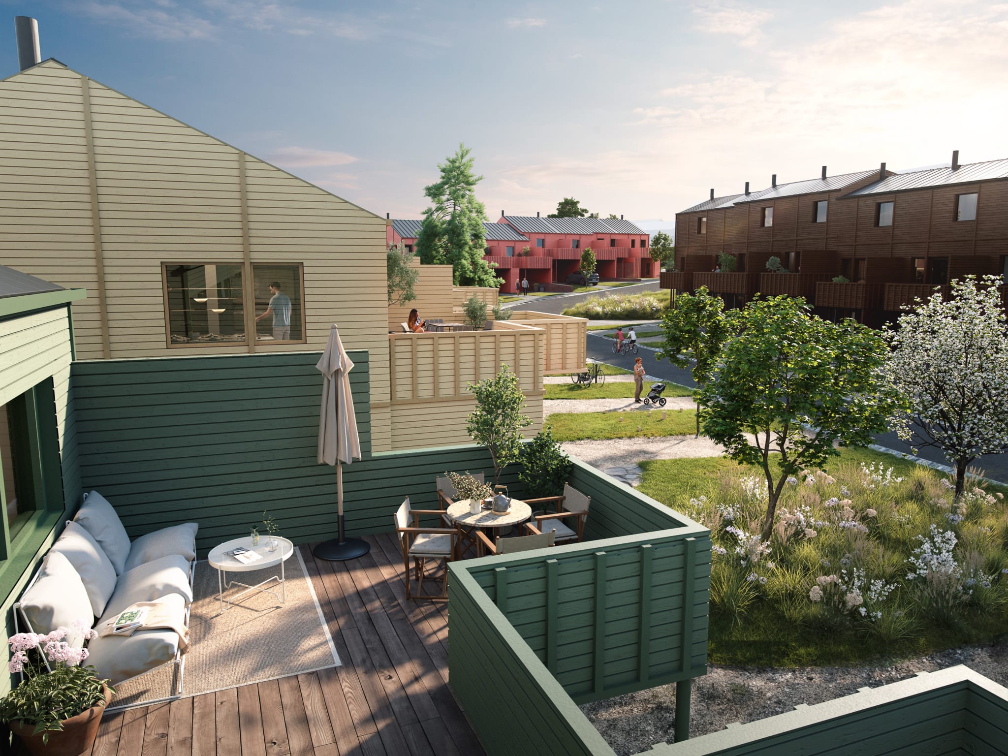 Husene i denne rekken vil ikke få noen hus foran seg og kan nyte godt av den rolige og fantastiske utsikten mot skog, jorder og fjell. Husene inneholder tre romslige soverom, kjellerstue/kontor, to bad, stor balkong med direkte utgang fra kjøkken og en stor stue med 4 meters takhøyde.