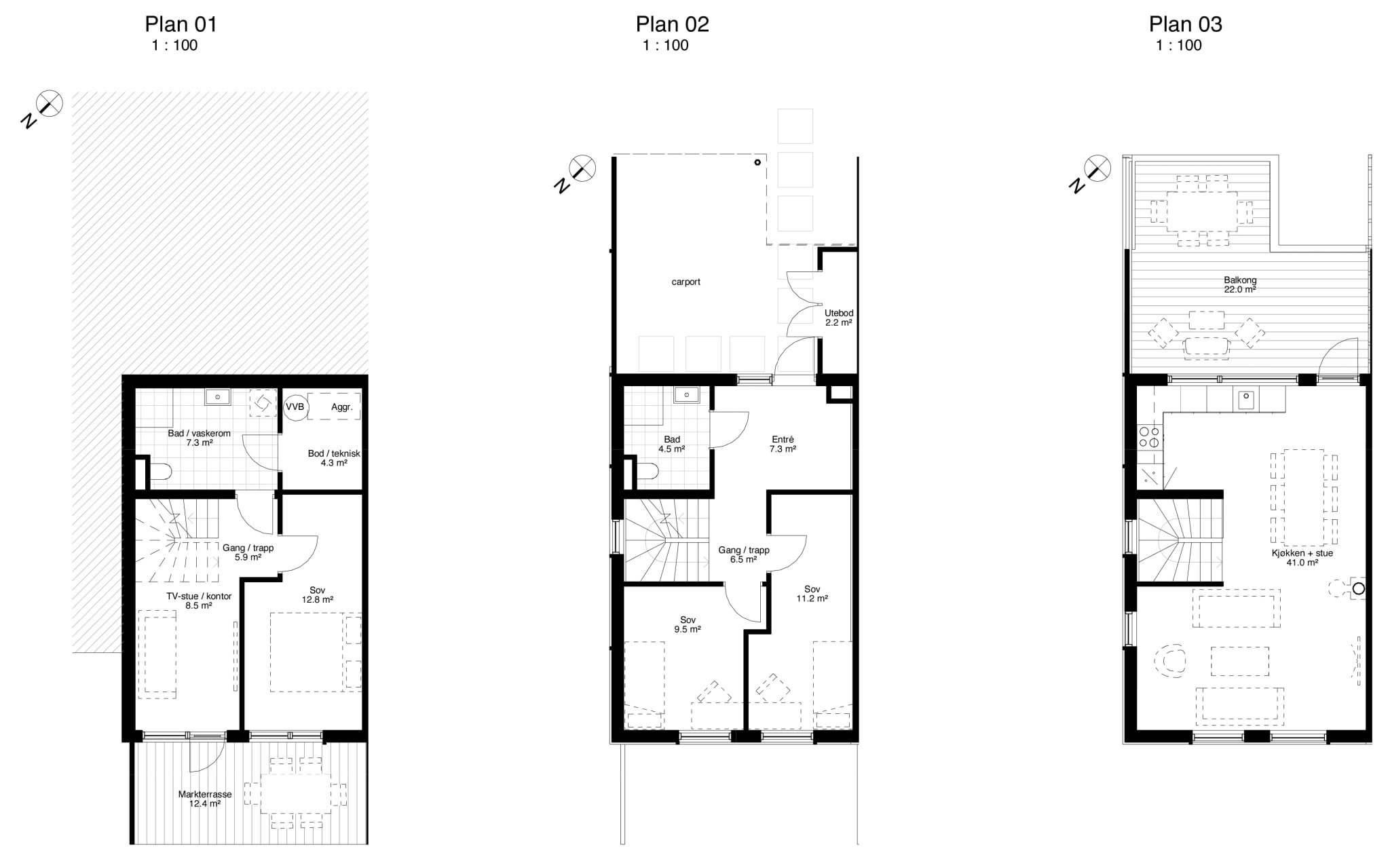 Husene i denne rekken vil ikke få noen hus foran seg og kan nyte godt av den rolige og fantastiske utsikten mot skog, jorder og fjell. Husene inneholder tre romslige soverom, kjellerstue/kontor, to bad, stor balkong med direkte utgang fra kjøkken og en stor stue med 4 meters takhøyde.