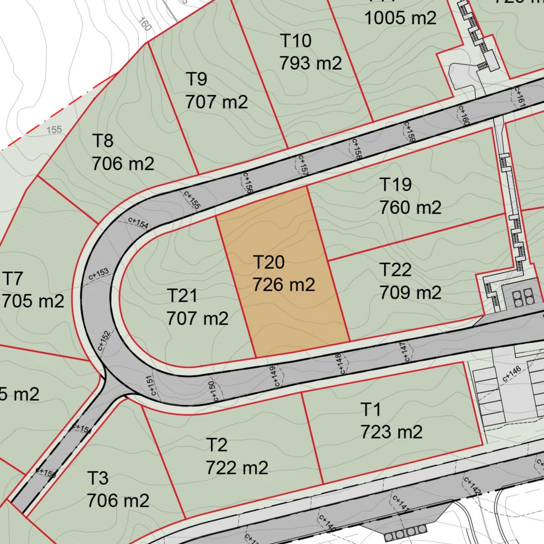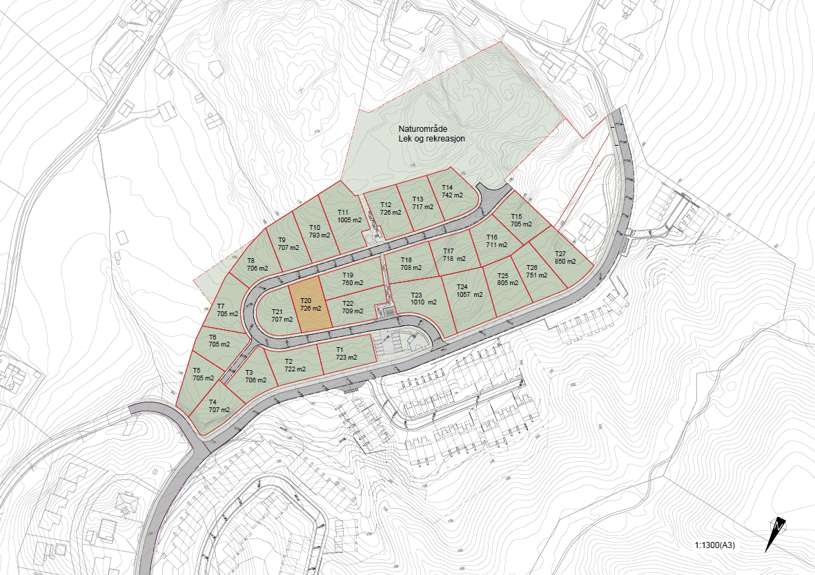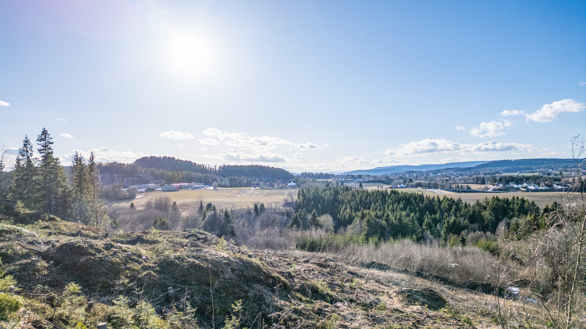 Denne tomten gir mange muligheter. Boligen kan plassere slik at den ligger høyt i terrenget med avkjørsel og inngang oppe fra øst eller nede fra vest.