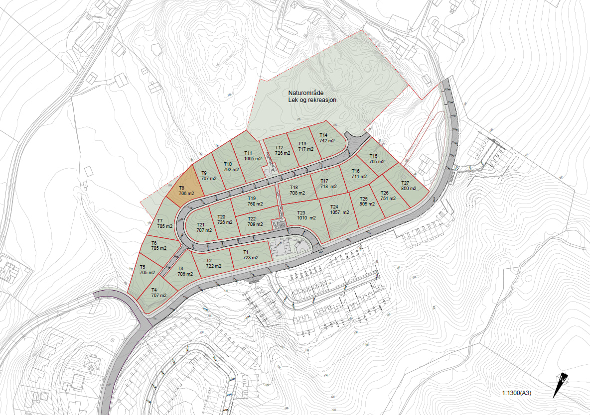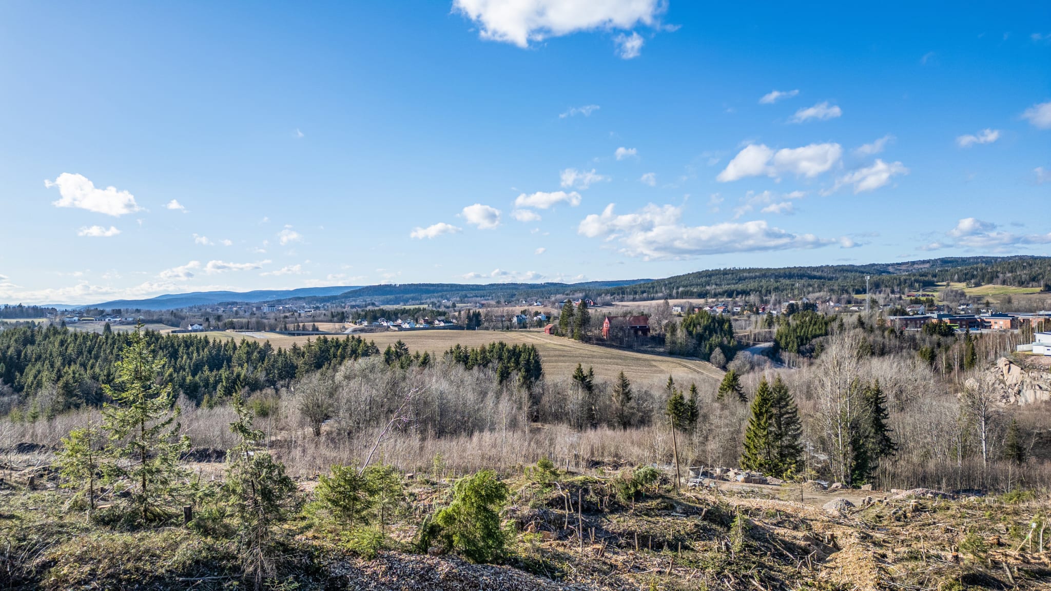 På vei opp mot feltets høyeste nivå ligger denne flotte og terrasserte tomten – helt i skogkanten. Dette gir mulighet for spennende valg av hus på flere nivåer.